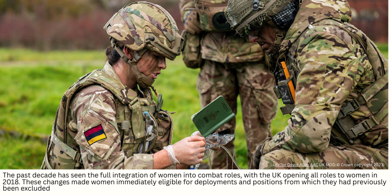 The past decade has seen the full integration of women into combat roles, with the UK opening all roles to women in 2018 [4,14]. These changes made women immediately eligible for deployments and positions from which they had previously been excluded, but the underlying masculine norms of military culture remained [9].