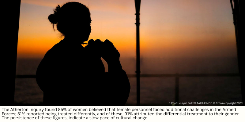 The Atherton inquiry found that 85% of women believed that female personnel faced additional challenges in the Armed Forces; 51% reported being treated differently, and of these, 91% attributed the differential treatment to their gender [1]. The persistence of these figures, along with statements from top personnel in the Armed Forces, indicate a slow pace of cultural change.