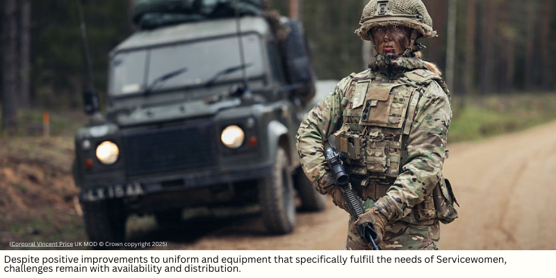 After receiving extensive criticism for failing to adapt uniforms and equipment to women’s bodies, the single Services have been working to make significant improvements. The Atherton Report highlighted these shortcomings, with 60% of Servicewomen reporting that equipment was inappropriate for female personnel and 77% noting that uniforms were unsuitable [1].