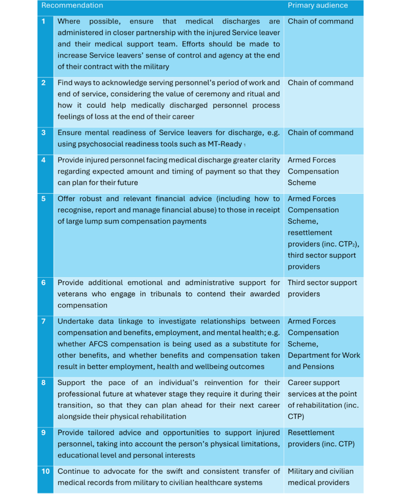 The report identified a number of ways in which medical discharge could be improved to better serve the needs of those leaving the Armed Forces with combat injuries. While some of these topics are already being addressed, e.g. by new policies, charitable provision, and so forth, it is important that continued surveillance be undertaken to determine whether these recommendations are actioned and the issues identified mitigated in the future.
