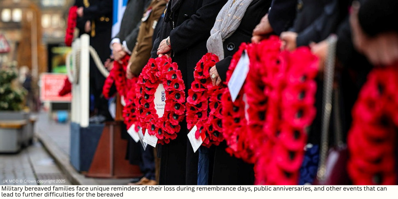 In addition to the loss of a loved one, bereaved military families face a range of unique challenges. Some of the most immediate changes include the potential loss of the military community, Service Family Accommodation, and Defence Medical Services. The grieving period is further compounded by a myriad of other factors specific to the military community, including potential media interest, impact of Service inquiries and inquests, and administrative tasks [2,3,6]. Unlike civilians, military bereaved families face unique reminders of their loss during remembrance days, public anniversaries, and other events that can lead to further difficulties for the bereaved [3,6]. Lastly, bereaved military families face many additional administrative tasks compared to their civilian counterparts [1]. For individuals grieving the loss of a loved one, the complexity of navigating bureaucracy can feel particularly overwhelming [6].